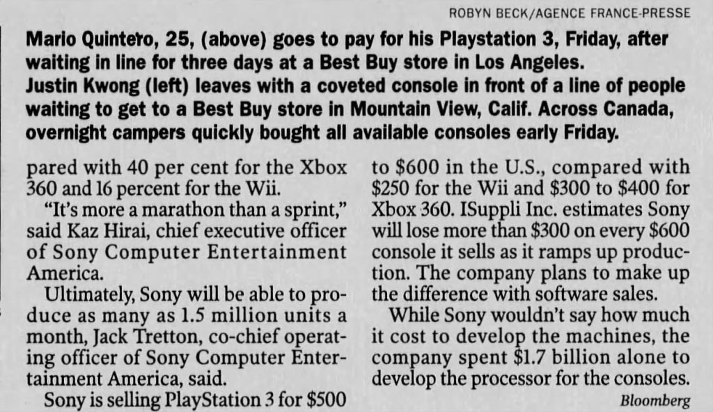 This humongous initial investment then forced Sony to make some horrendous decisions. Since the PS3 costed PlayStation a whopping $850, the MSRP was set at $600, which not only meant that Sony was loosing close to $300 on every console purchase, but even at that loss, the competitors were far from being priced similarly.