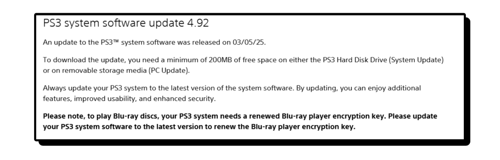 As Sony states, “to play Blu-ray discs, your PS3 system needs a renewed Blu-ray player encryption key,” hence with the older ones expiring, the company has pushed newer ones via an update. Keep in mind though that you must have at least 200MB on your disk to install this version 4.92 update.