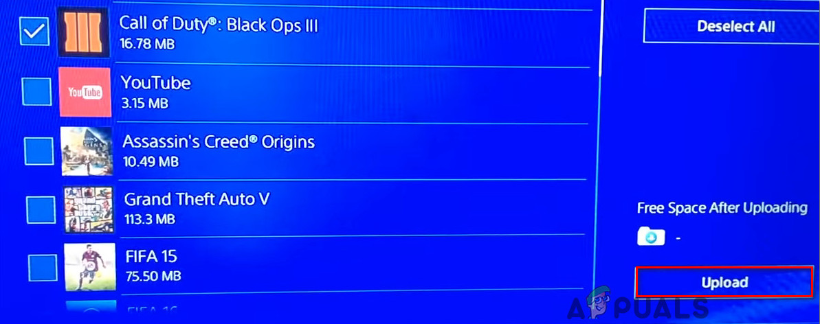 Select the appropriate backing option - Once you get to the next screen, press the Options button on your controller, and select Choose Multiple Applications. Then, go ahead and select every relevant save game that you want to preserve. Once every relevant content is selected, click the Upload/Copy button to begin sending them to the cloud or copy them over to a flash drive respectively.