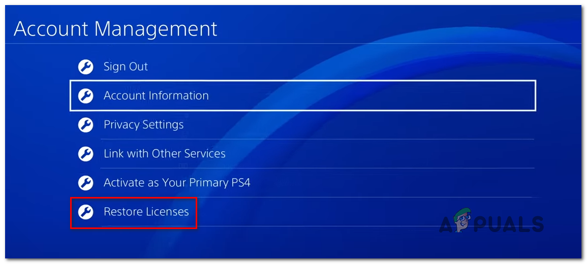 - Licensing inconsistency – As some affected users have reported, this problem can also be caused by a persisting licensing inconsistency that is determining your PlayStation system to deny access to a particular digital purchase. In this case, restoring the licenses from the Account Management menu should allow you to fix the problem.