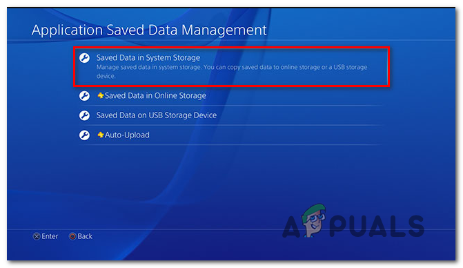 Accessing the Settings menu on PS4 - From the insides of your Settings menu, access the Application Saved Data Management menu, and then choose Saved Data in System Storage.