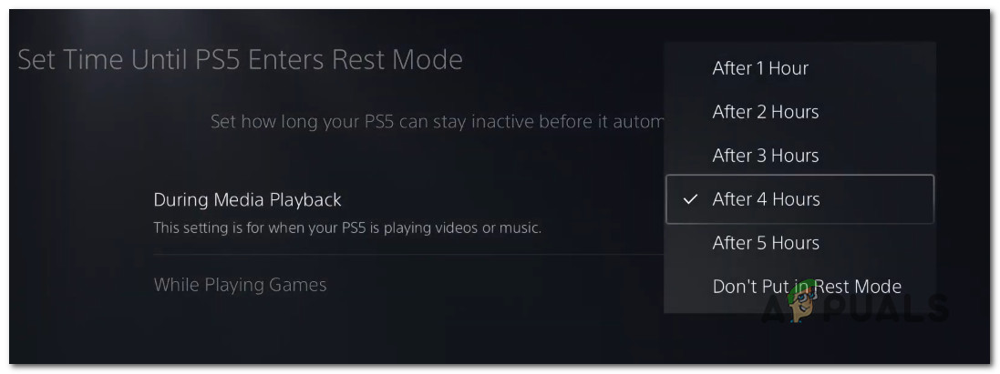 Accessing the Set Time Until PS5 Enters Rest Mode - Then in the Set Time Until PS5 Enters Rest Mode menu, set the drop-down menus of During Media Playback and then While Playing Games to Don’t Put in Rest Mode option.