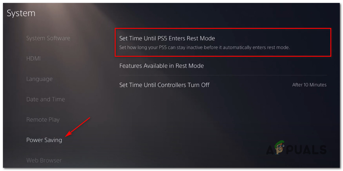 - And with the selected Power Savingmenu, go to the right-hand side and choose the Set Time Until PS5 Enters Rest mode menu.