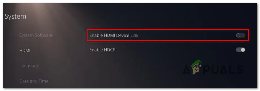- HDMI Device Link artifact – If the HDMI Device Link artifact is enabled on your console, chances an artifact can prematurely trigger shut down signals once you are in the middle of a gaming section. This is fairly common with Roku and other similar devices. In this case, you can resolve the issue by disabling the HDMI Device link from the settings menu (if you’re not actively using the HDMI Device Link feature).