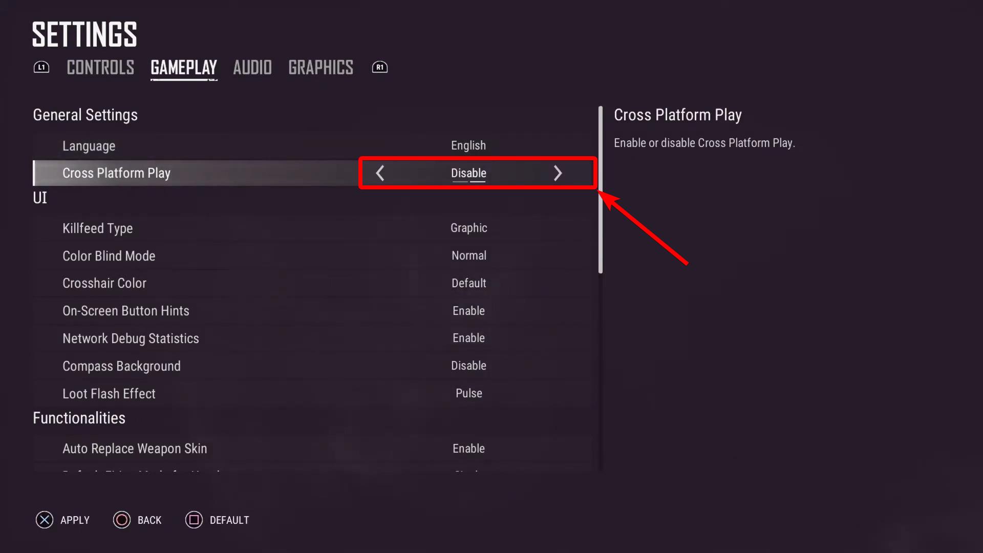 Navigate to Gameplay Settings - Enable/Disable Crossplay: Select ‘Cross Platform Play’ and set it to ‘Enable’ to activate crossplay or ‘Disable’ to turn it off.