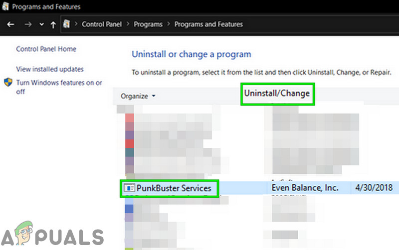 Uninstall a Program - Now select “PunkBuster Services” in the list of installed software, and then click the “Uninstall/Change” button.