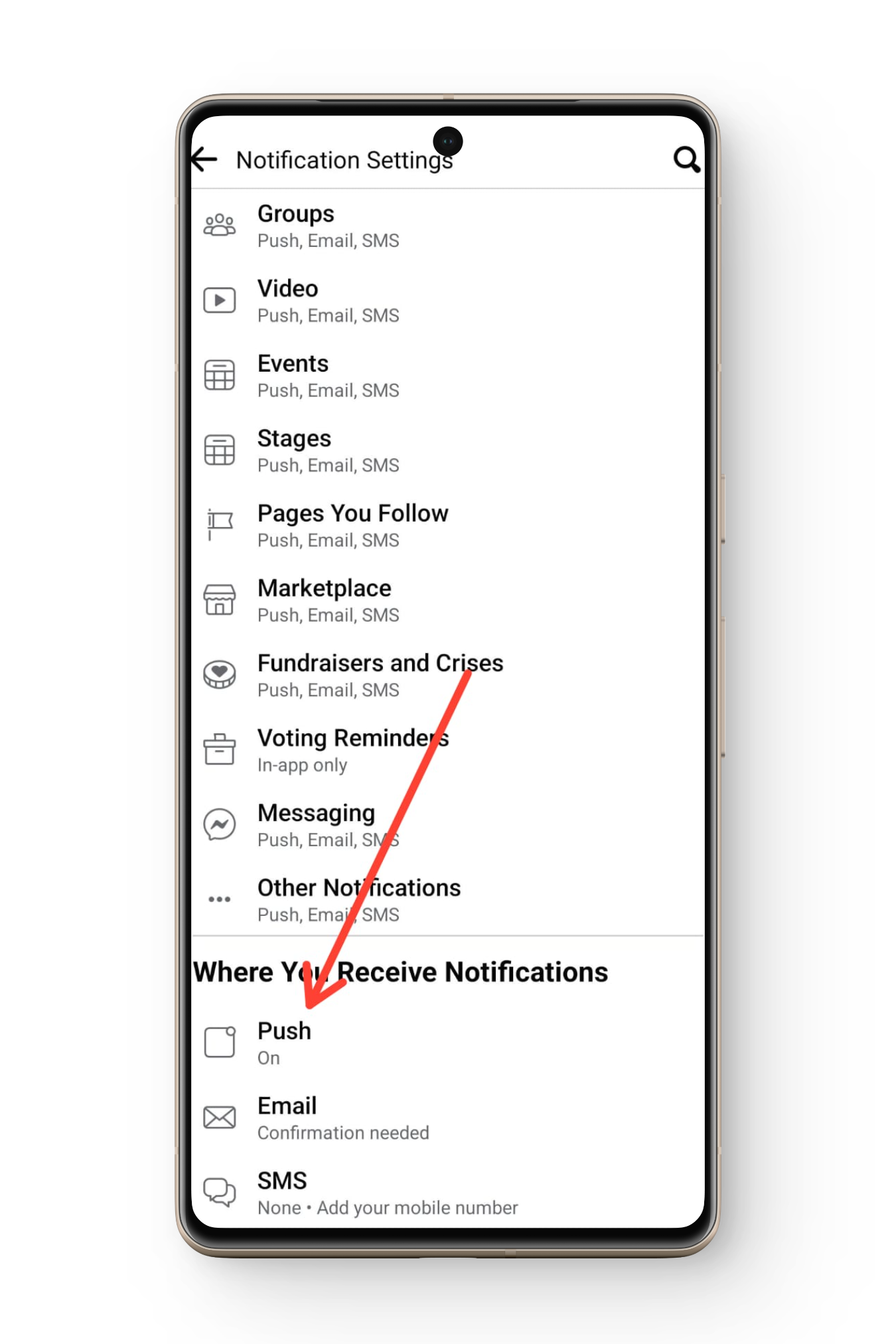 Push - In case you want to completely turn off notifications of all types, on the Notification Settings page, scroll down to Where You Receive Notifications.
