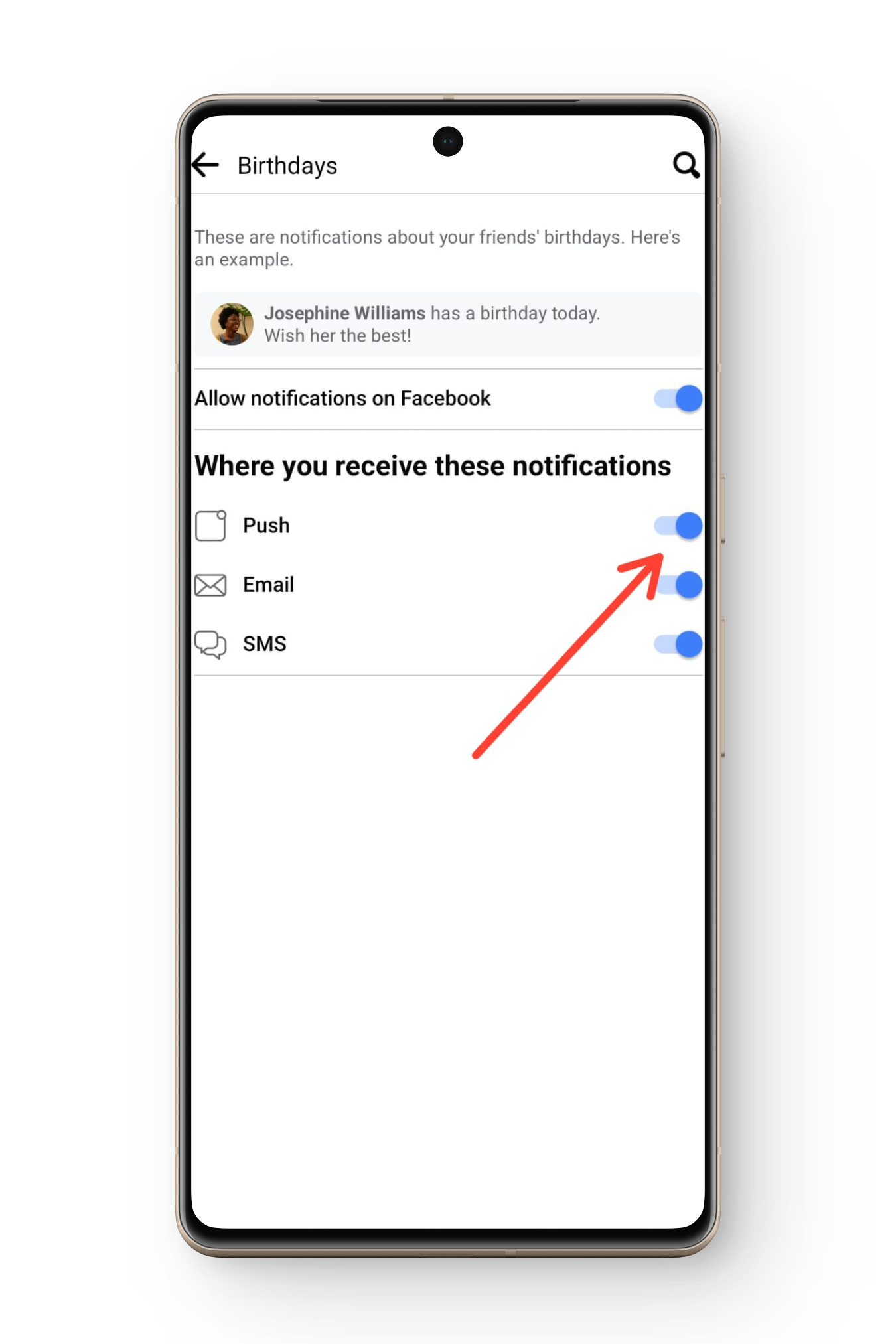 - Toggle off Push if you want to completely turn off the notifications for a specific type.