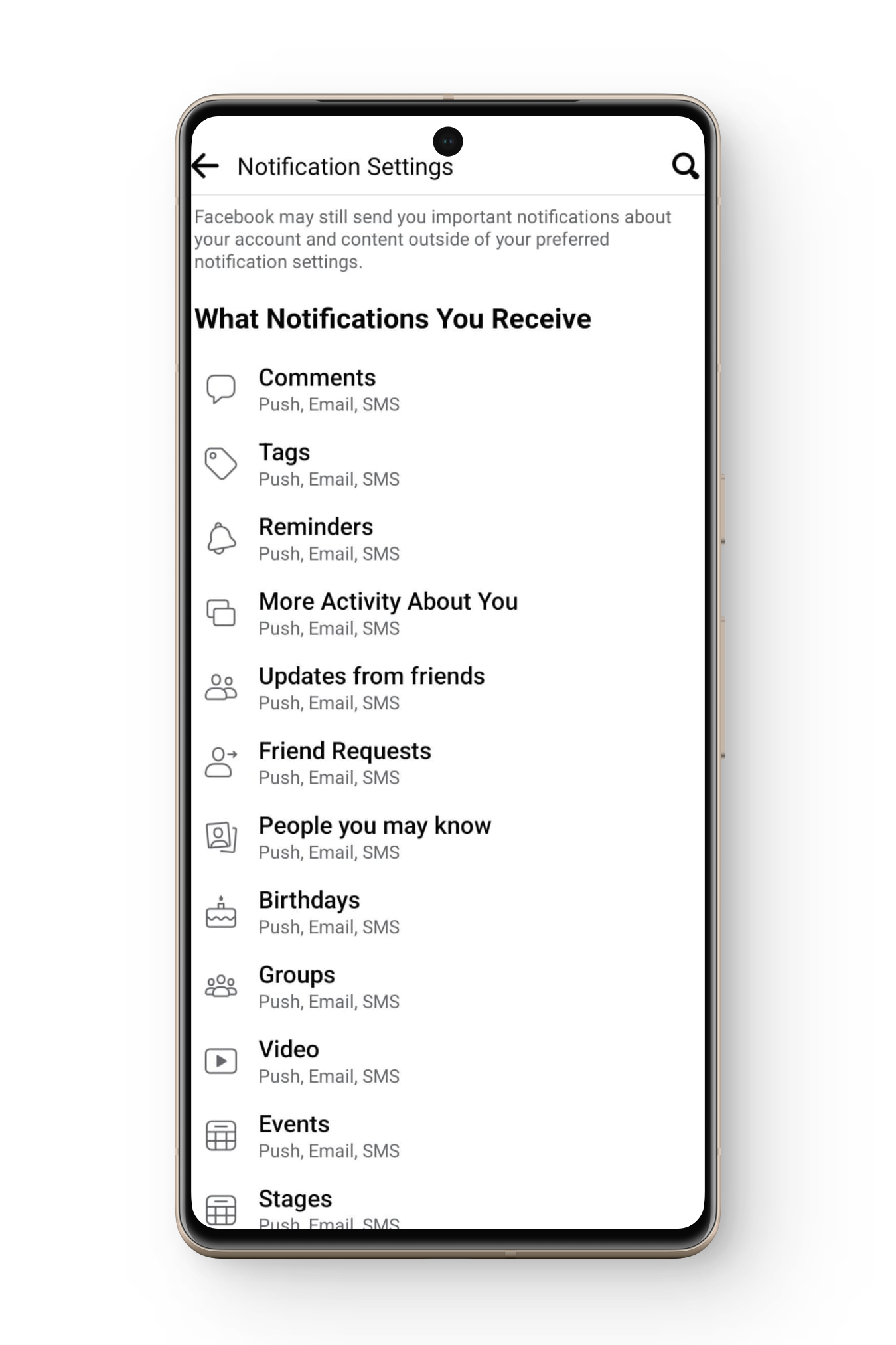Push - In case you want to completely turn off notifications of all types, on the Notification Settings page, scroll down to Where You Receive Notifications.