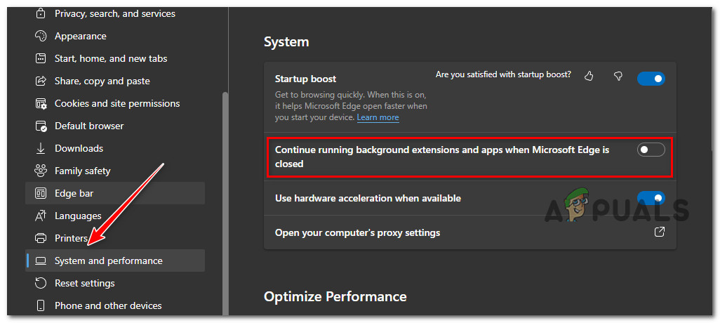 - Edge extensions are running in the background – According to affected users, you can expect to deal with this problem due to a series of Chrome-specific extensions that are permitted to run in the background long after the browser is closed. To prevent this issue from occurring, you can fix the issue by re-configuring the behavior of Edge to disallow Edge Extensions from running in the background once the main browser is closed.