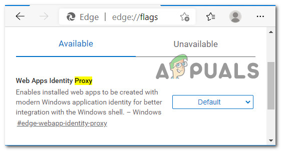 - Web Apps Identity Proxy is enabled – According to several affected users; you can hope to experience this problem because the identity proxy for web apps is enabled. Several affected users have confirmed that they managed to fix the problem by accessing the Flags menu inside Microsoft Edge Chromium and disabling the Web Apps Identity Proxy.