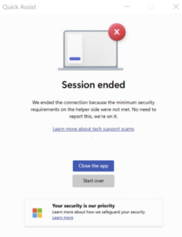 When Quick Assist displays the error “We ended the connection because the minimum security requirements were not met“ (also logged as “Quick Assist session ended – minimum security requirements not met”), it typically indicates that the connection attempt failed due to a network or system configuration that does not meet Microsoft’s current security standards.