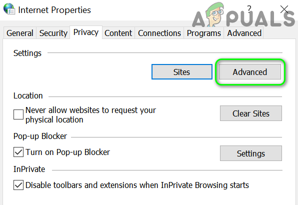Open Internet Options in the Control Panel - Then navigate to the Privacy tab and click on the Advanced button.