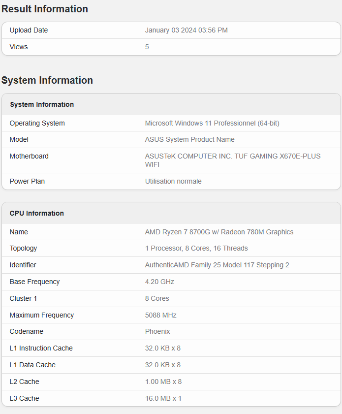 The test bench features an ASUS TUF GAMING X670E PLUS WiFI motherboard paired with the Ryzen 7 8700G. The CPU hosts 8 cores / 16 threads using the Zen4 architecture. Using such a configuration, it yields 8MB of L2 cache and 16MB of L3 cache.