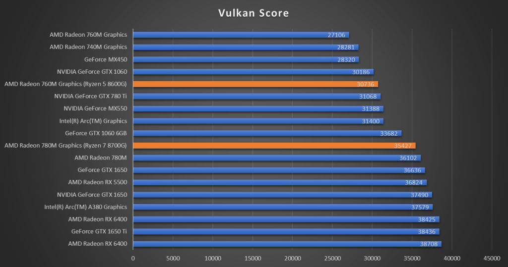 The graph below demonstrates that the Radeon 780M easily beats out the GTX 1060 6GB in Vulkan. Moreover, with capable memory kits, one can expect even after performance, comparable to the likes of the GTX 1650 / RX 6400.