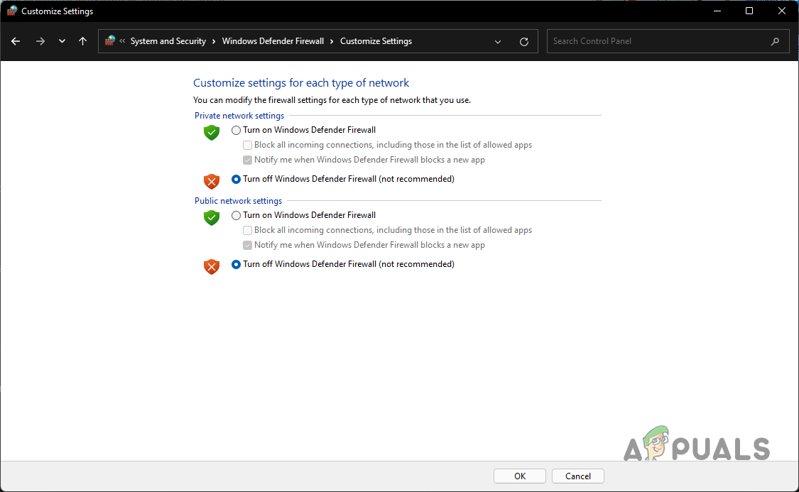 Access the Windows Defender Firewall - A page will open; there go for the option Turn off Windows Defender Firewall (not recommended) for both Private and Public Network