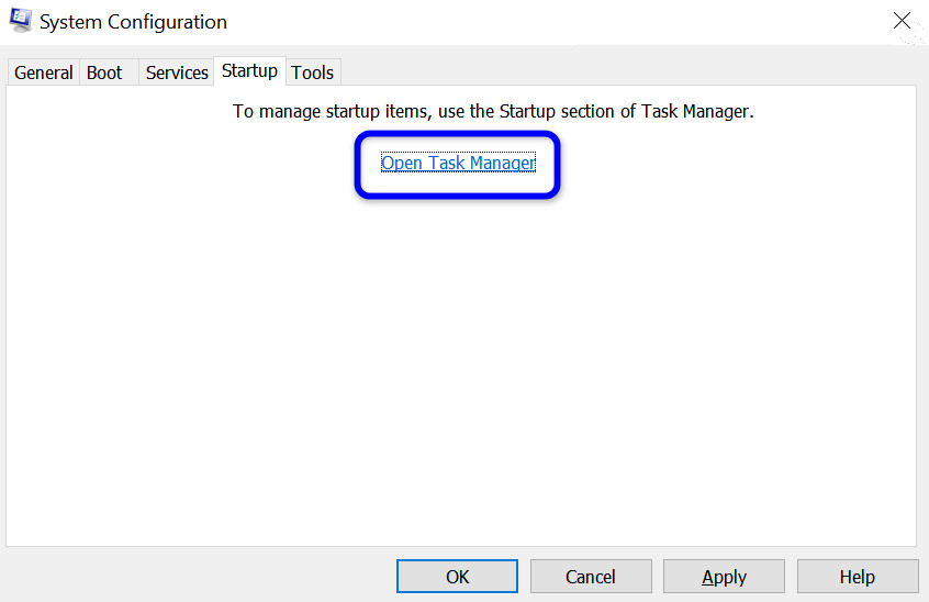- Next, click on the Startup tab and then click on the option Open Task Manager.