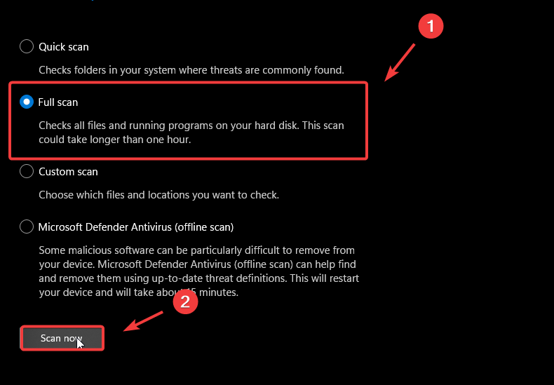 - When the Scan Options menu appears, choose the Full Scan option to scan your entire system for threats. Once selected, click on Scan Now to begin the scanning process.