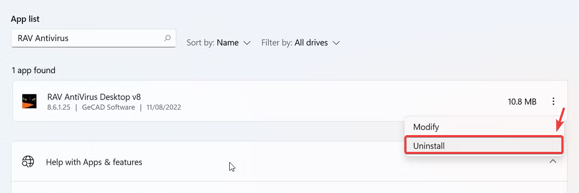 If you cannot see RAV Antivirus in Settings > Apps & Features, uninstall it from the Control Panel. Follow these steps: