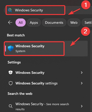 - Press the Win key (on your keyboard) and, in the search bar that appears, type Windows Security, then press Enter.