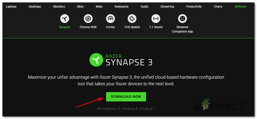 - Once you are inside the correct page, click on Download Now (under Razer Synapse 3) and wait until the installation executable is fully downloaded.