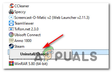 Opening the Programs and Features screen - Inside the Programs and Features screen, scroll down through the list of installed programs and locate the entry associated with Razer Synapse. When you see it, right-click on it and choose Uninstall from the context menu that just appeared.