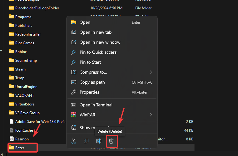 - Locate and delete the Razer folder.