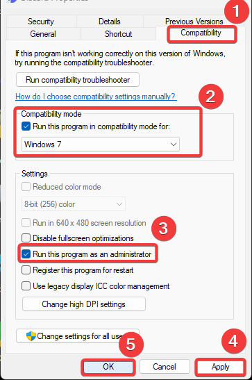 - Check Run this program as an administrator, then click Apply and OK to save the settings.