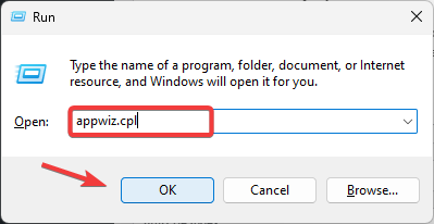 - Type appwiz.cpl and click OK to open Programs and Features in Control Panel.