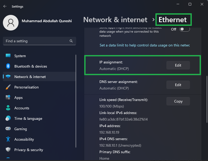 Click on Ethernet - Scroll down in the Ethernet Settings and click Edit on the “IP Assignment” option.