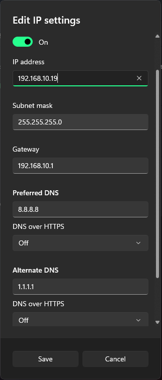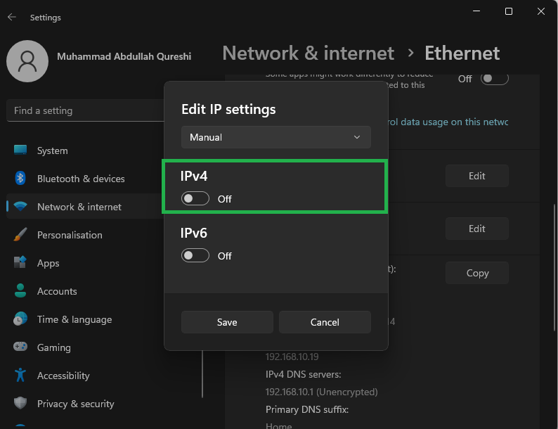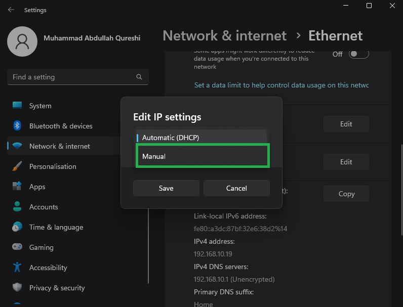 Click on IP Assignment - From the dropdown menu, select “Manual” to assign a custom IP to your PC.