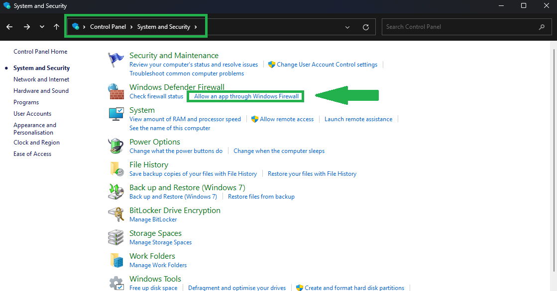 - Select “Allow an app through Firewall” in the Windows Defender Firewall subheading.