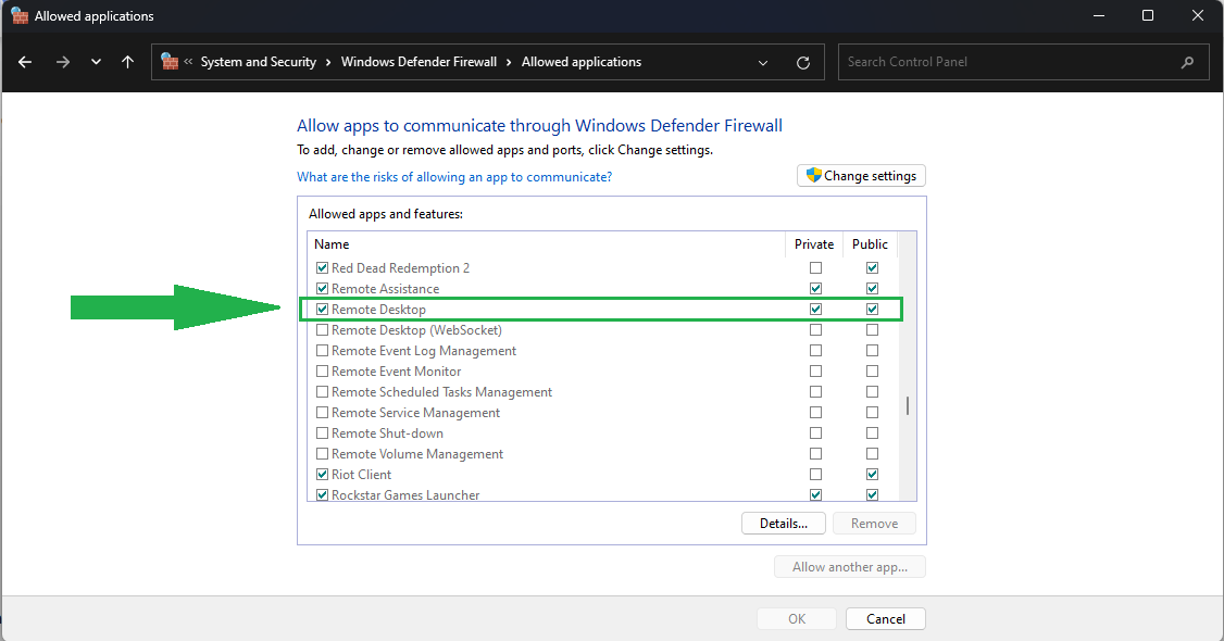 Select Windows Defender Firewall in Control Panel - Check Remote Desktop from the given list to allow the app through Firewall. This ensures connectivity through the Internet. For normal Windows users, this option will already be checked, and this step is not compulsory.