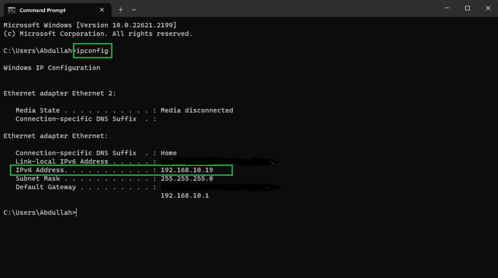 - Type “ipconfig” in the CMD