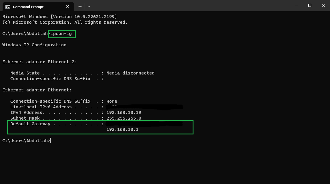 You can find your network’s default gateway using the same steps as your IP address in the section above. Simply open Command Prompt, type ipconfig and press Enter. The gateway should be underneath your IP.