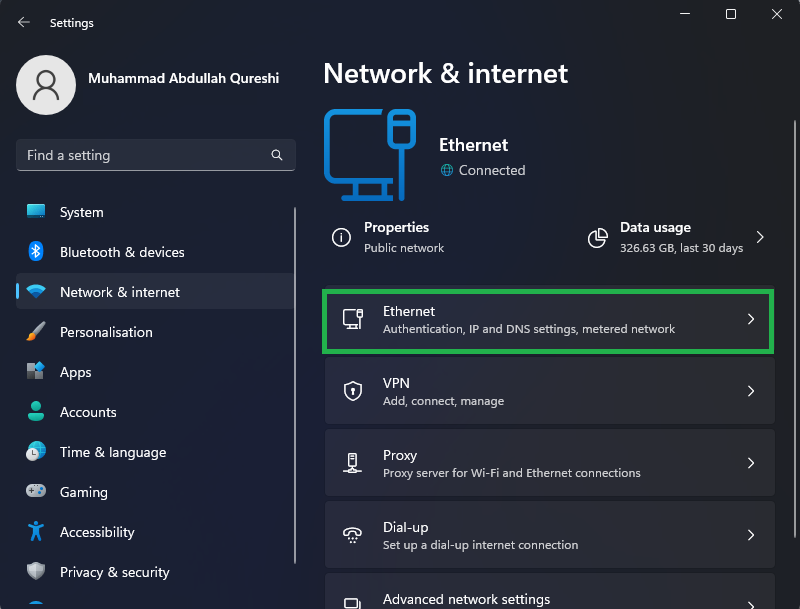 Network and Internet in Settings - In the Network and Internet settings, click on “Ethernet.”