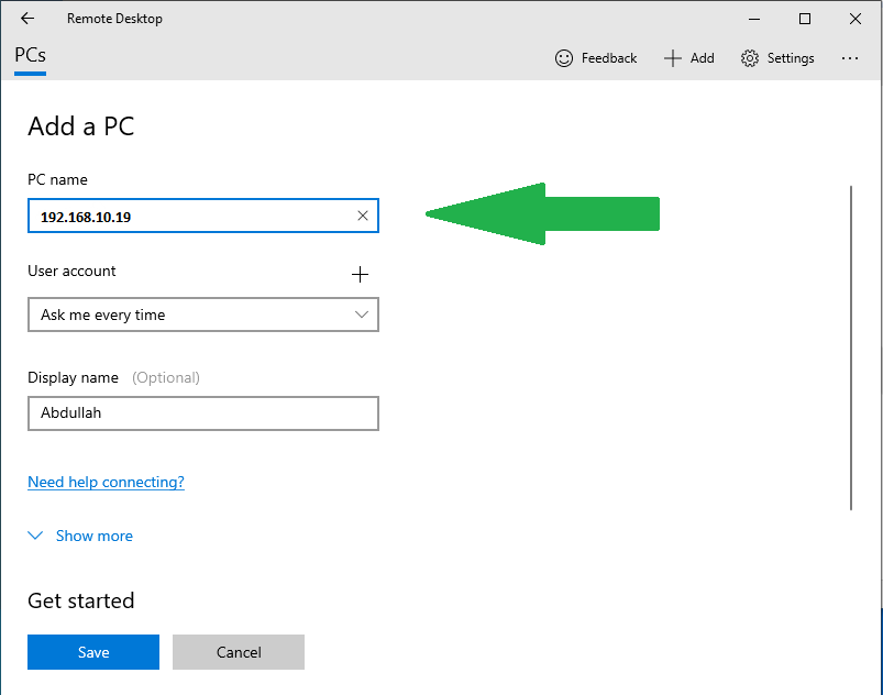 Add Host PC on Remote Desktop - After clicking on the Add button, you will now enter the details of the Host PC. In the PC name, enter the IP address of the Host PC. Beneath that, select the User account that you want to initiate the connection with (client). You can also optionally enter a Display name if you want.