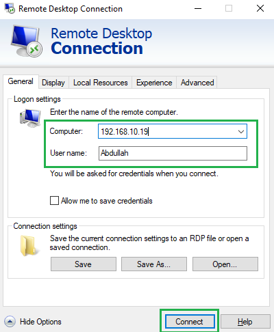 Open Remote Desktop Connection - Enter the IP Address of the Host PC and the Username of the account you want to access on the Host PC.