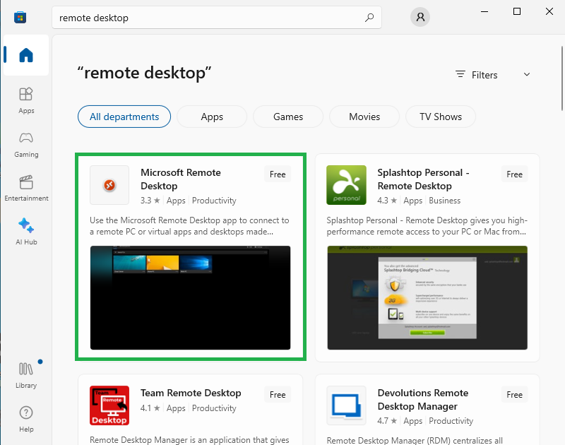- Navigate to the Microsoft App Store and search for the Remote Desktop application. Download the app as shown below: