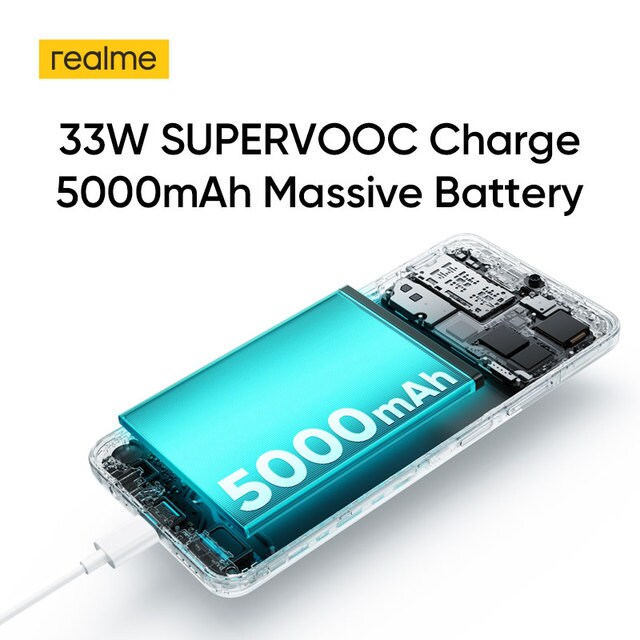 This phone is equipped with a 5000mAh battery and supports 33W SUPERVOOC Charge over USB-C port. The camera setup includes a 50MP Main camera and a 0.08MP Portrait Camera, while a 5MP camera is used for selfies. Additionally, it features a side-mounted fingerprint scanner for enhanced security. On software side, it runs run on Android 13 OS with realme UI T Edition on top.