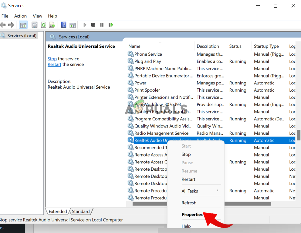 - Now right-click on the Realtek audio universal services and click on the Properties.
