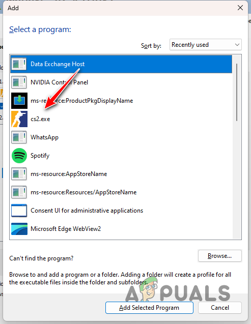 Adding New Program - Then, select cs2.exe from the list to add Counter-Strike 2 to the list.