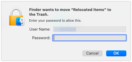 Moving Relocated Items Folder to Trash - Now, enter your Admin Password to confirm.
