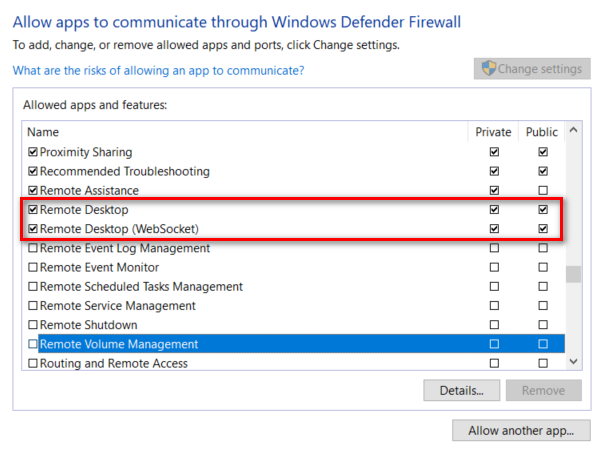 Allowing the Remote Desktop Protocol in Windows Firewall - Do the same for Remote Desktop (WebSocket) and click OK to save the changes.