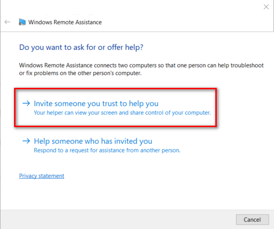 - In the Windows Remote Assistant wizard, click Invite someone you trust to help you.