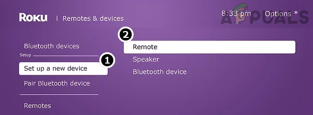 Open Remote & Devices in the Roku Settings - Now select Set Up a New Device and select Remote.