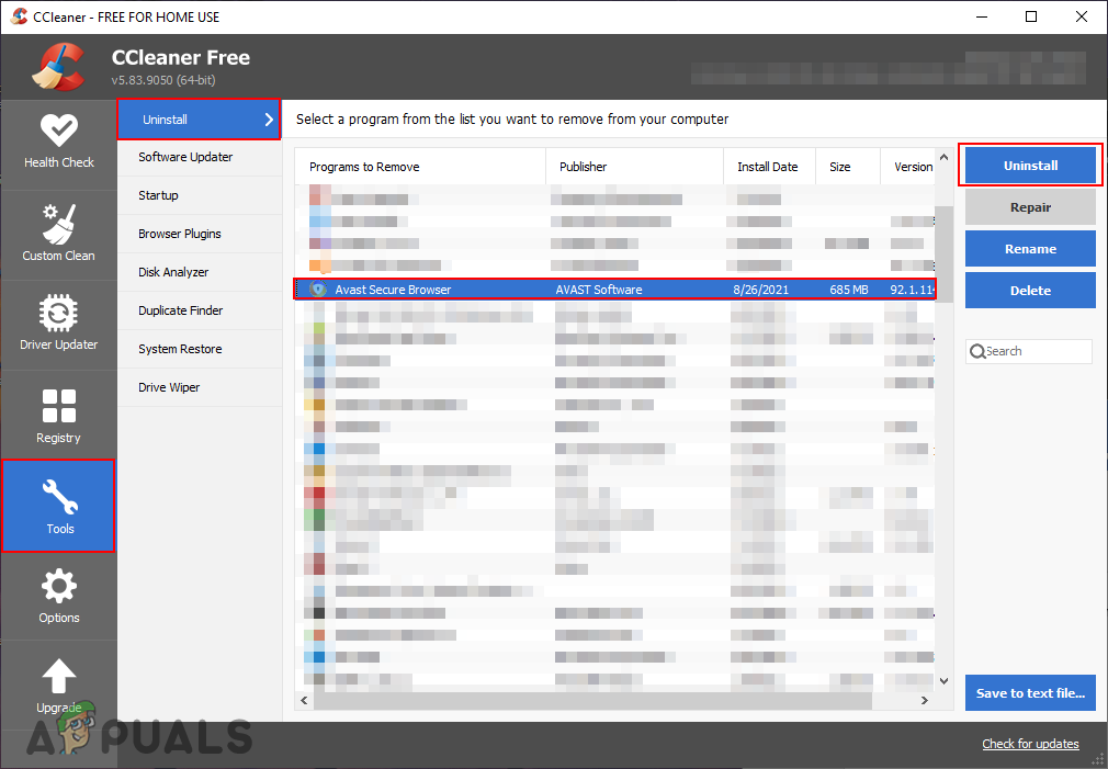 Uninstalling Avast Secure Browser through CCleaner - It will bring up the uninstallation window for the Avast Secure Browser. You can uninstall the application completely by clicking on the Uninstall button.
