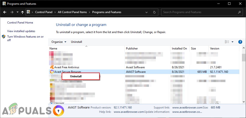 Opening Programs and Features in Control Panel - Scroll down and search for the Avast Secure Browser. Right-click on it and choose the Uninstall option.