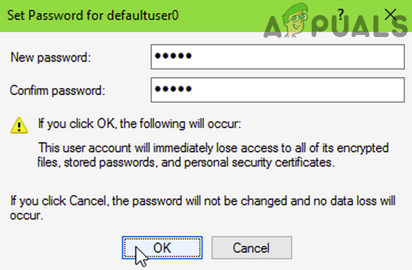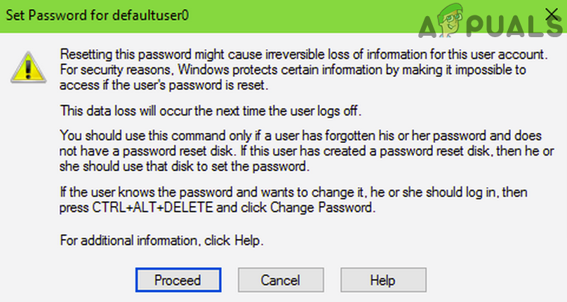 Set Password on the Defaultuser0 Account - Then select Set Password and in the warning box, click on Proceed.