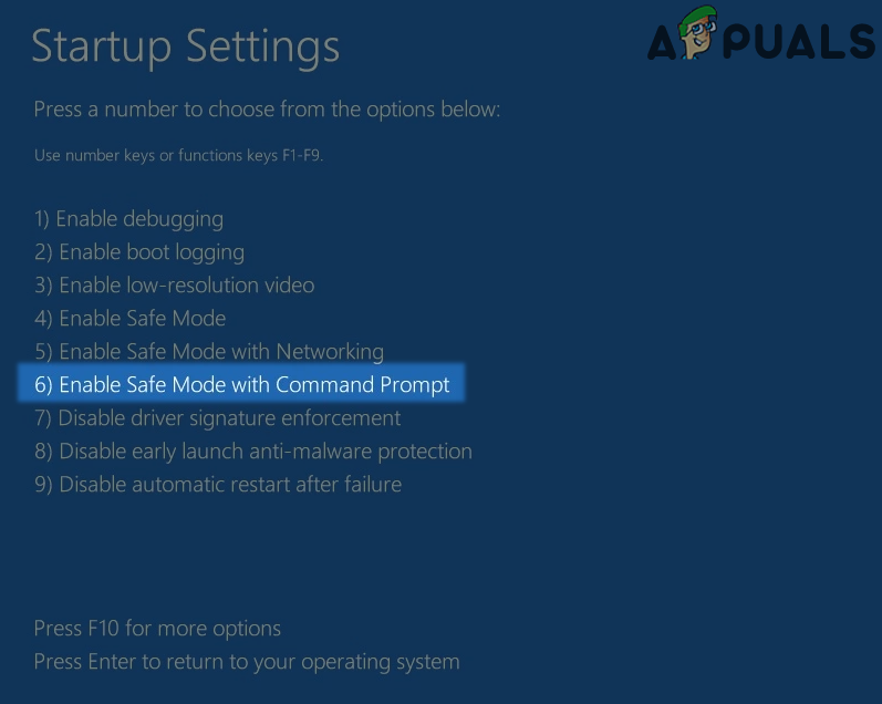 - Then the system will reboot and upon reboot, on the screen of Startup Settings, press 6 to start your system in the Safe Mode with Command Prompt.